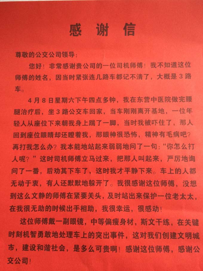 2017年4月18日下午,家住錦華四區的牟翠英老人拿著感謝信來到市公交公司汽車一隊,感謝3路車駕駛員馬慶龍師傅見義勇為的高尚品德。據車隊了解得知,4月8日下午,牟翠英老人乘坐馬慶龍駕駛的從公交西站至公交公司的3路公交車回家,車輛行駛途中,一位年輕人朝牟翠英老人身上踹了一腳,回到座位后眼睛還瞪著牟翠英老人,牟翠英老人當時很害怕。正在駕駛車輛的駕駛員馬慶龍發現后,在銀座購物廣場站點停下車,進一步了解情況后,勸那位年輕人下了車。