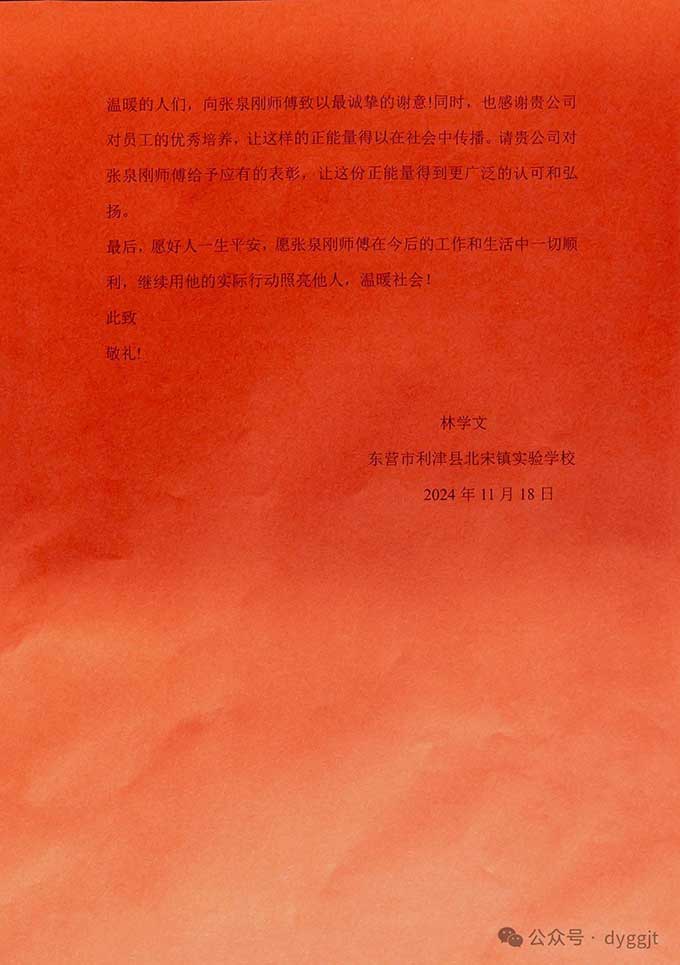 車主林先生特意寫來一封感謝信并制作了一面錦旗表達(dá)謝意,字里行間充滿了對(duì)張泉?jiǎng)値煾档母屑ぶ椤K谛胖刑岬剑瑥埲獎(jiǎng)値煾档男袨樵缫殉搅斯获{駛員的基本職責(zé)范疇,堪稱守護(hù)城市安全衛(wèi)士和傳遞正能量的楷模一點(diǎn)也不為過。他用實(shí)際行動(dòng)生動(dòng)詮釋了“見義勇為”這一中華民族的傳統(tǒng)美德,同時(shí)也彰顯了東營(yíng)市公交集團(tuán)在職工品德教育方面的卓越成效,以及對(duì)培養(yǎng)職工社會(huì)責(zé)任感的高度重視。
