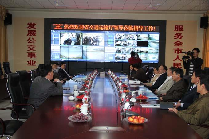 檢查組在相關領導的陪同下來到東營公交智能調度指揮中心進行了實地檢查與座談。工作人員將公交智能調度系統(tǒng)的實時監(jiān)控、數(shù)據(jù)查詢、統(tǒng)計等功能和公交3G視頻監(jiān)控系統(tǒng)的遠程視頻監(jiān)控、錄像資料查詢、遠程指揮調度以及安全防范等功能向謝廳長以及各位領導進行了詳細的講解和演示。