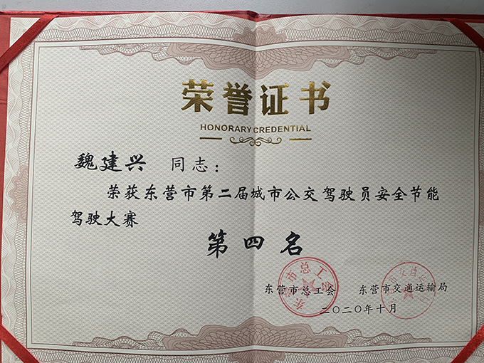 魏建興榮獲“東營市第二屆城市公交駕駛員安全節能駕駛大賽第四名”